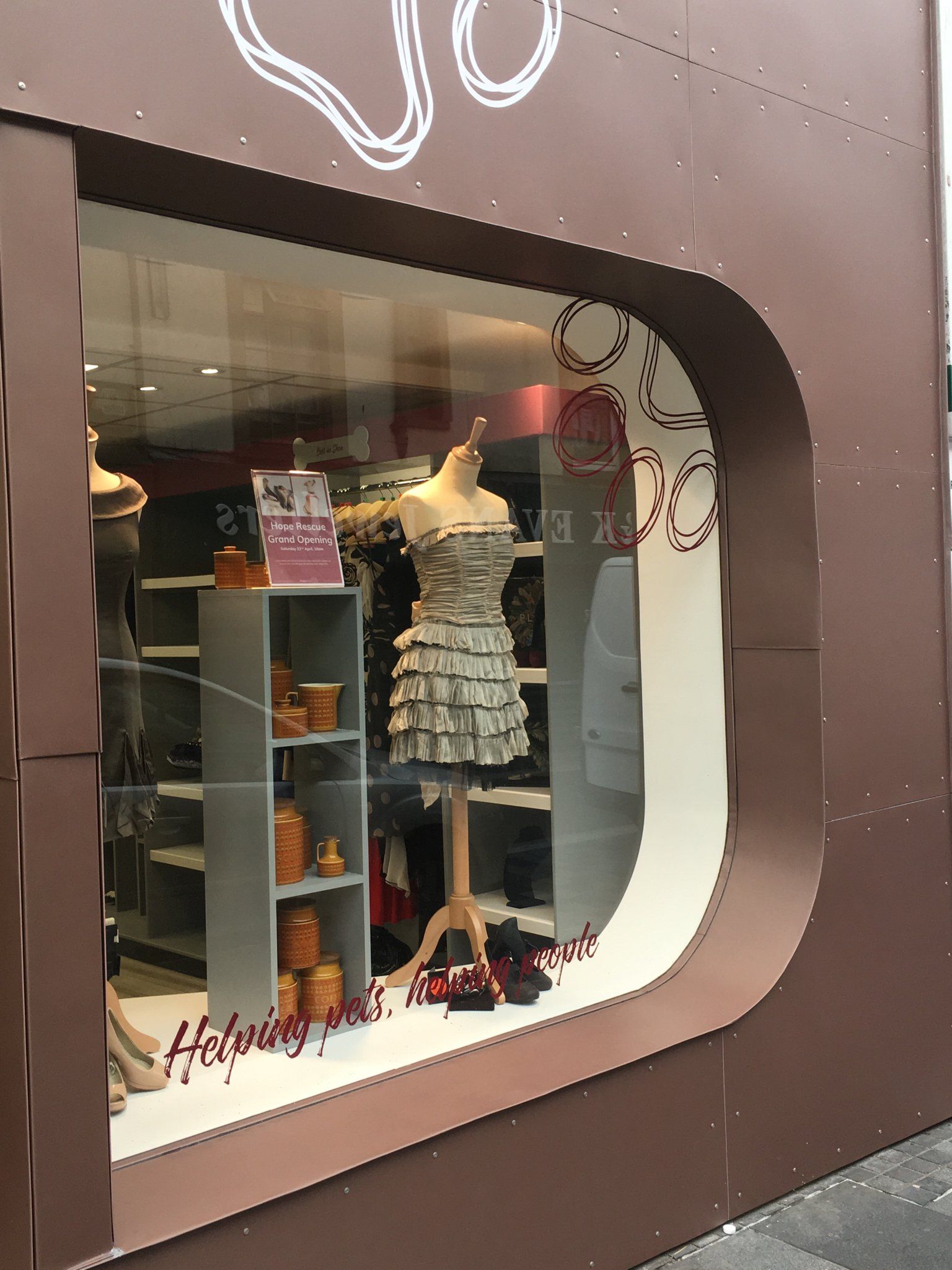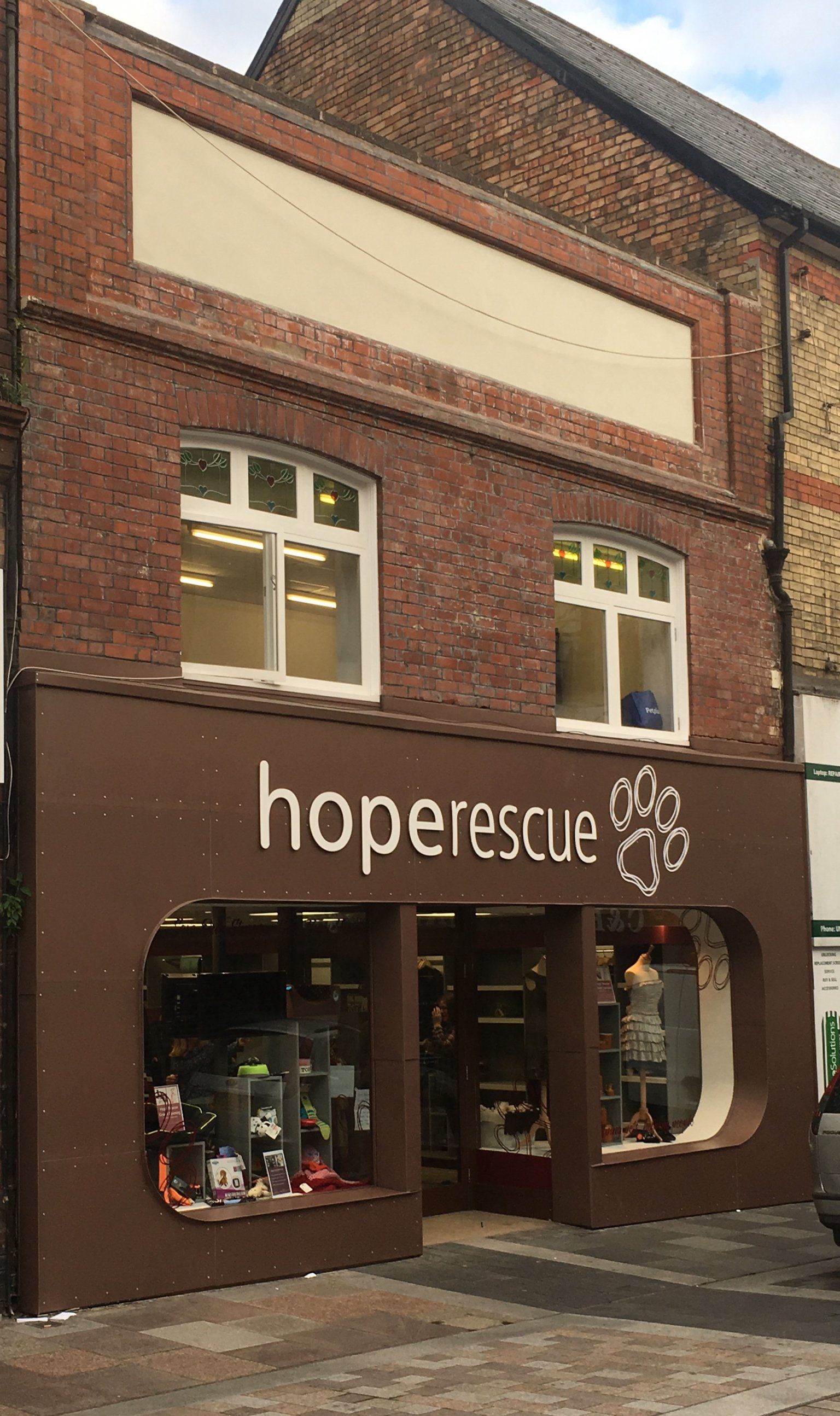 This project involved the re-design of an unremarkable typical high street shop front to a bespoke shop front for the headquarters and retail outlet of the dog rescue charity Hope Rescue.