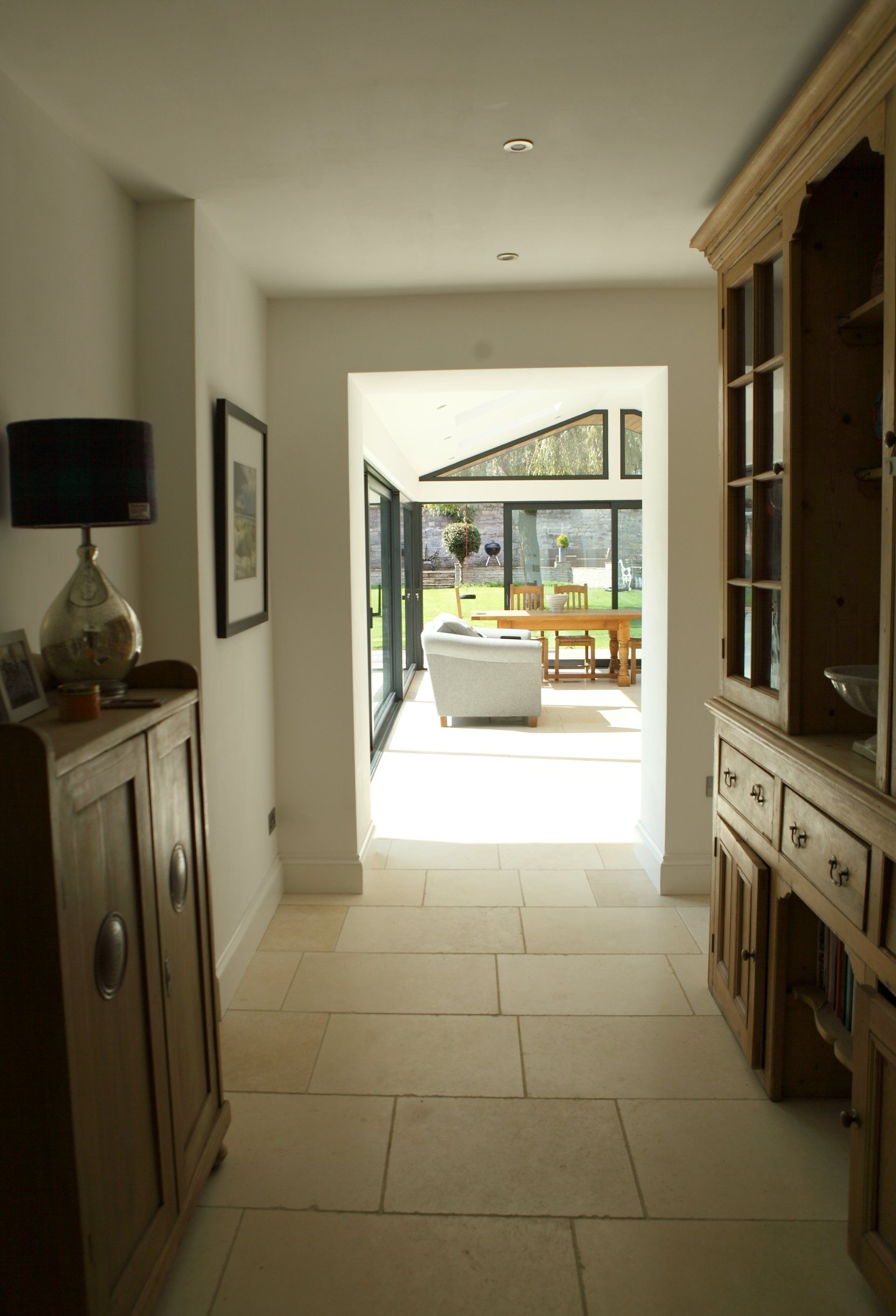 One of the challenges was making a large internal space feel homely and not overbearing. The use of large format floor tiles (1.2 x 1.2 m) helped reduce the scale and impact of the open space. Large expanses of Fineline glazing to the rear opened the house the rear garden, terrace and surrounding aspect.